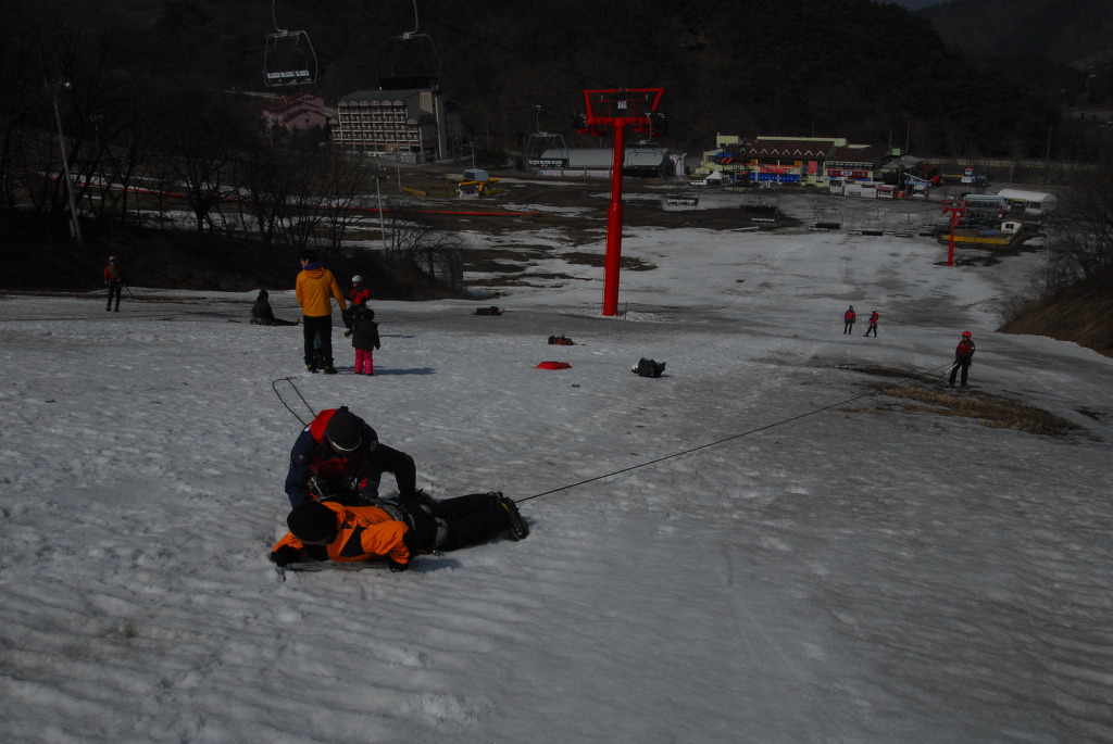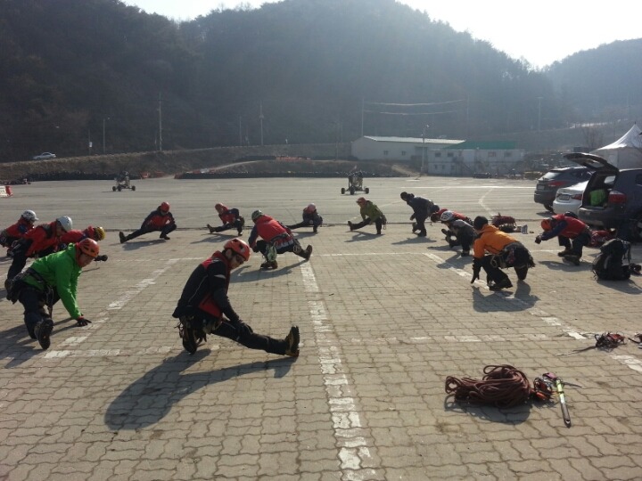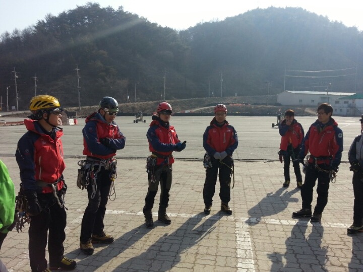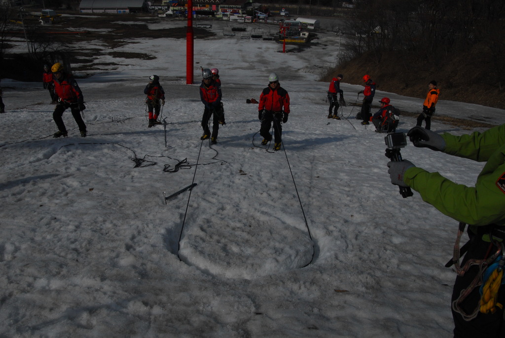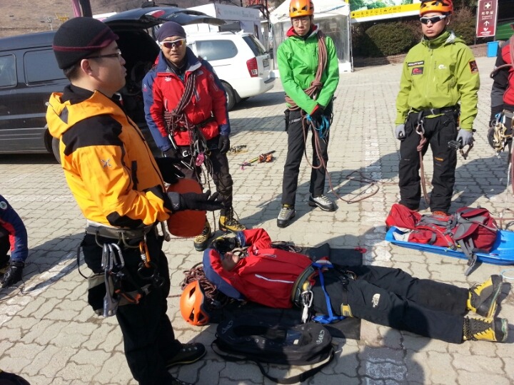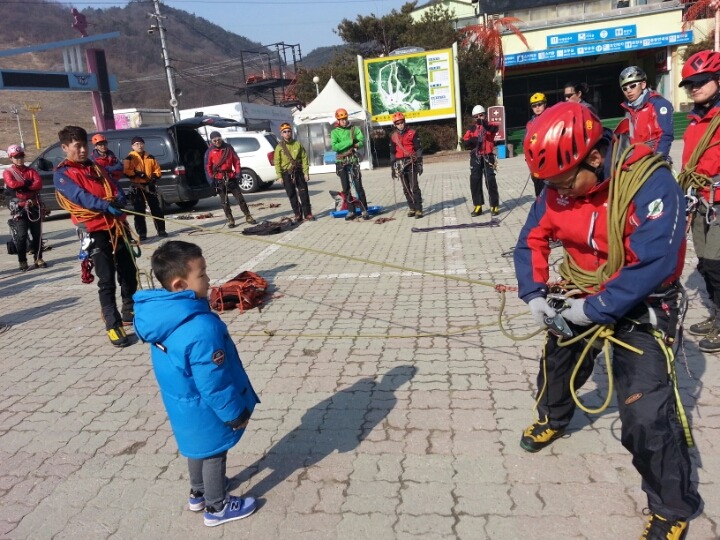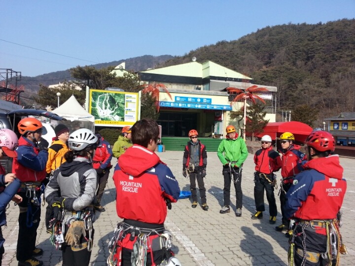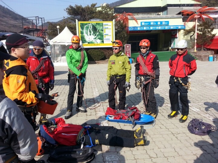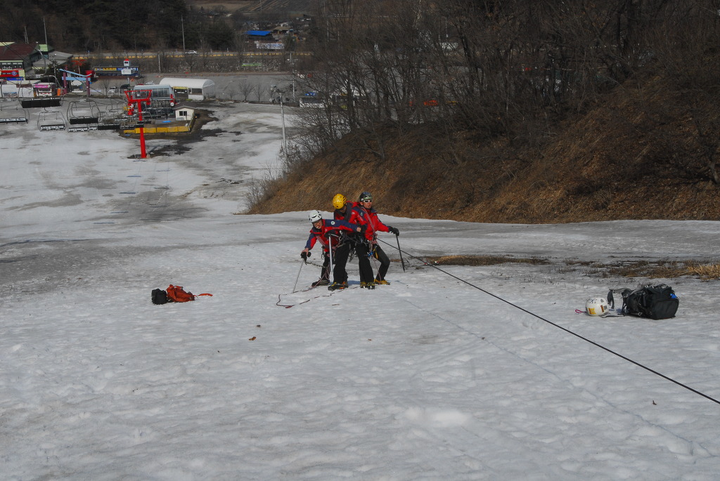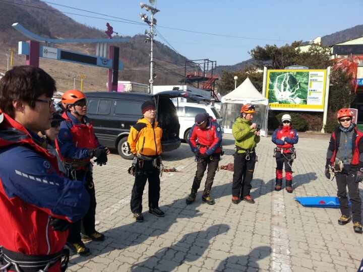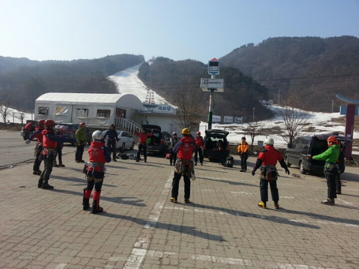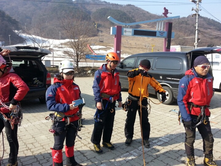 2015년 3월 8일(일) 수안보사조리조트에서 매년하는 실시하는 안자일렌,활락정지,크레바스에서의 자가탈출등의 설상구조교육을 실시하였습니다.