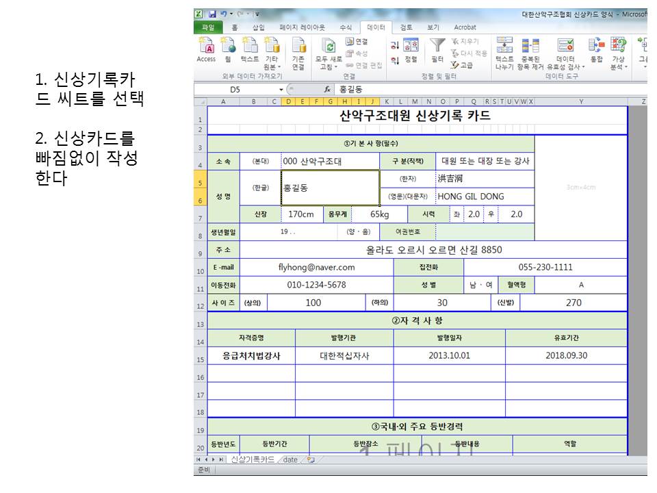 구조대원 신상카드 작성 서식 및 메뉴얼입니다.