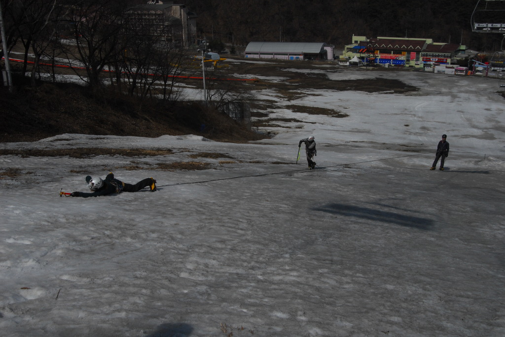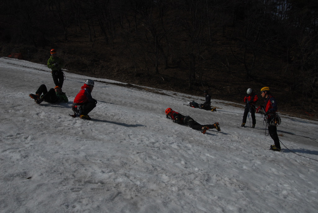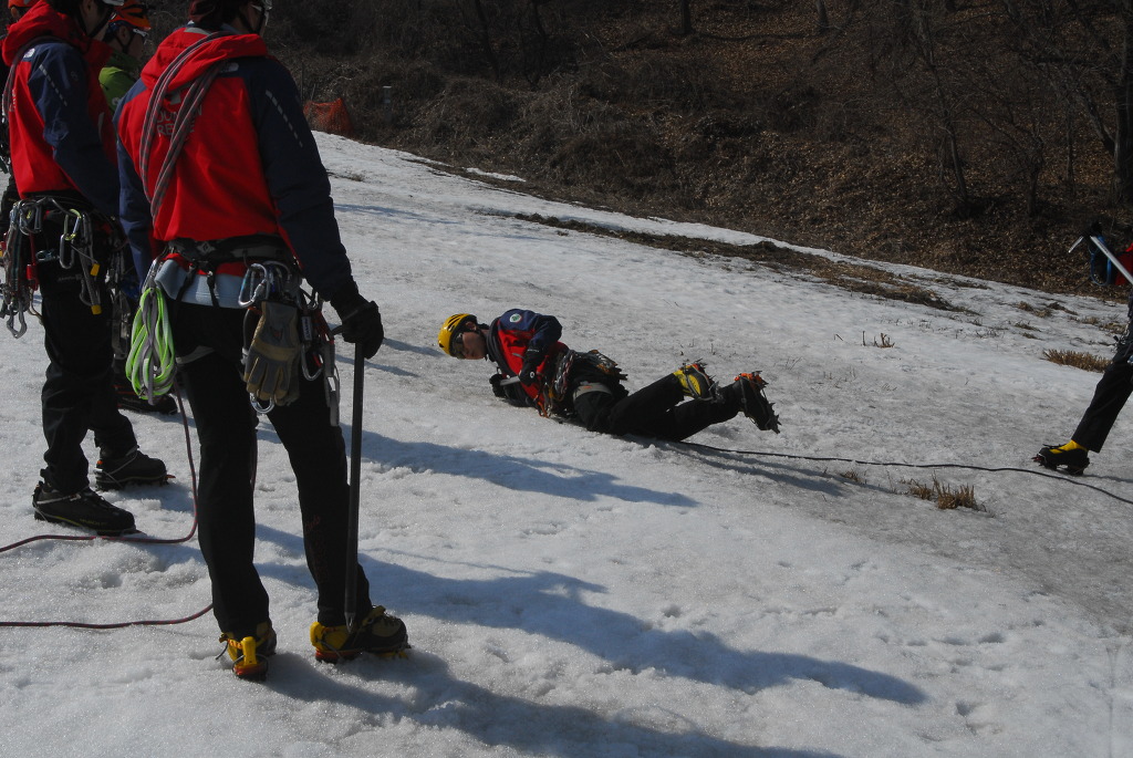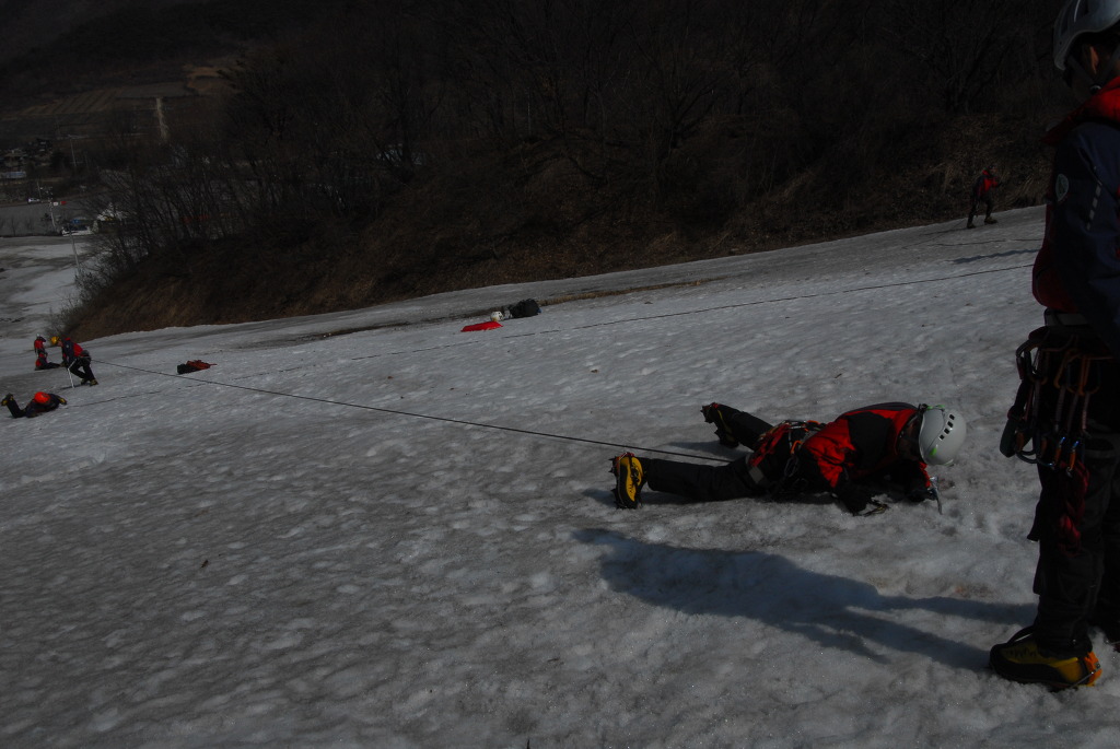 내 용 : 안자일렌(3인 1조, 2인 1조), 활락정지, 홀링시스템, 자가탈출, 응급처치, 하강(스노 볼라드)