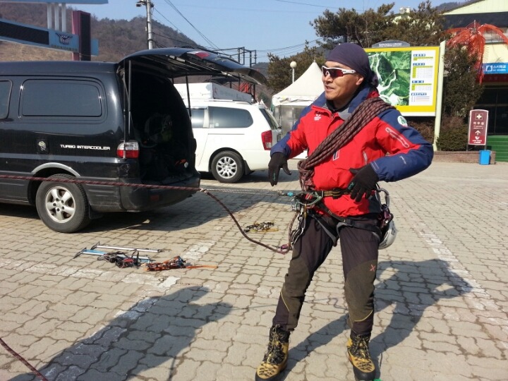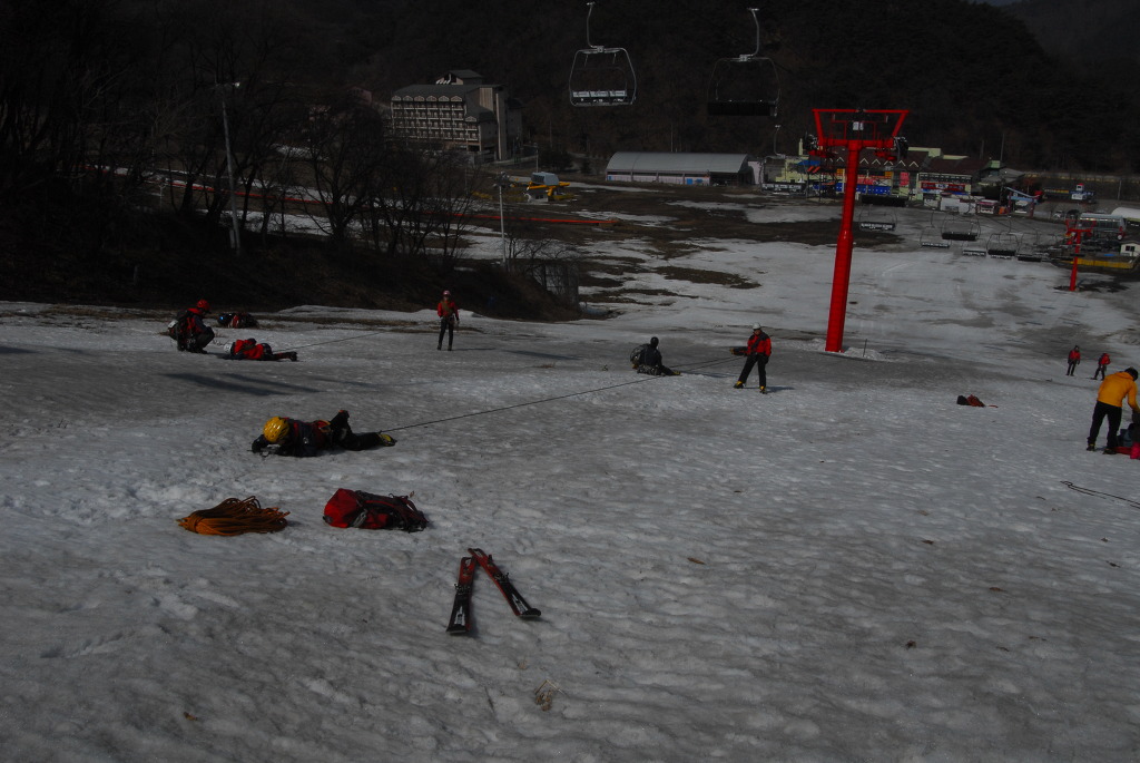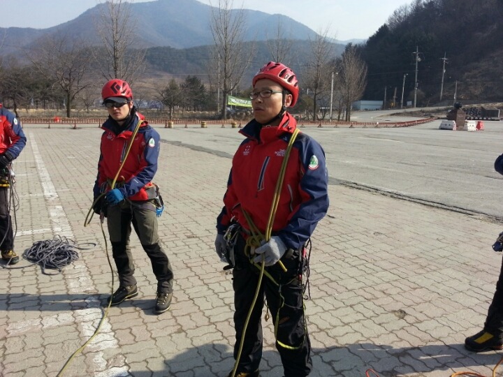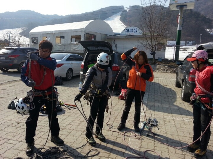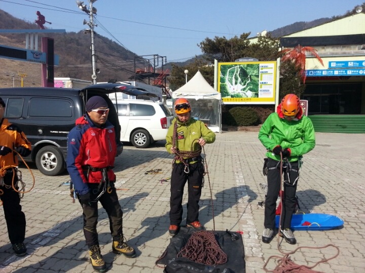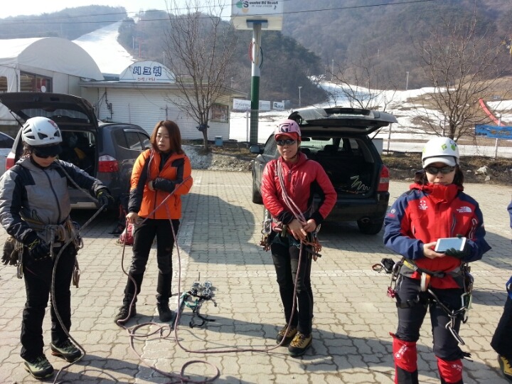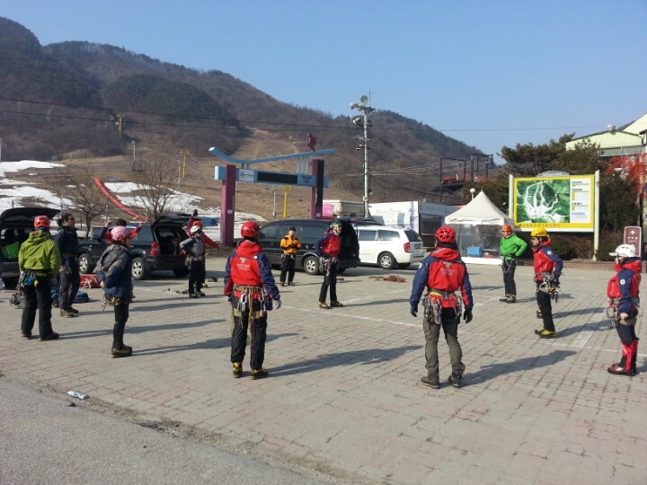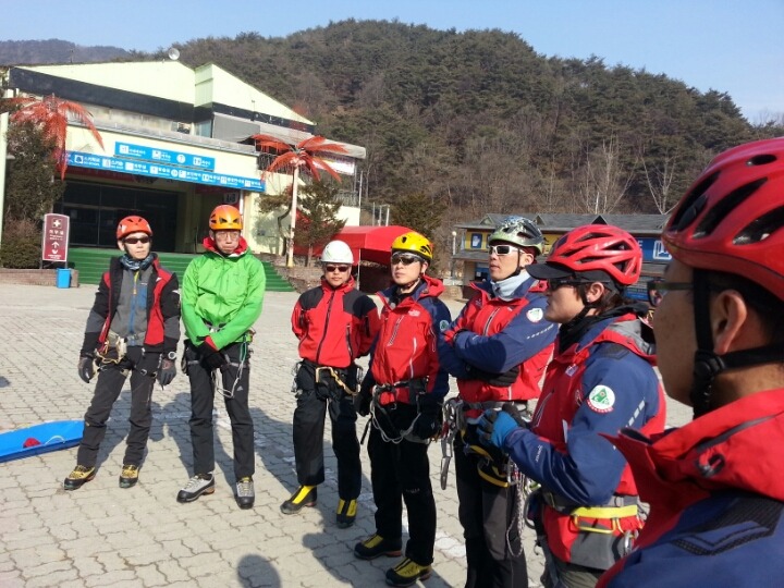 2015년 3월 8일(일) 수안보사조리조트에서 매년하는 실시하는 안자일렌,활락정지,크레바스에서의 자가탈출등의 설상구조교육을 실시하였습니다.