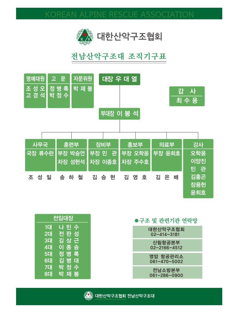 대원들의 역량 강화를 위해 지속적인 구조기술을 연마하고 있으며 각각 대원들은 전남산악연맹을 이끌어 가는 중추적인 역할을 해오고 있습니다.